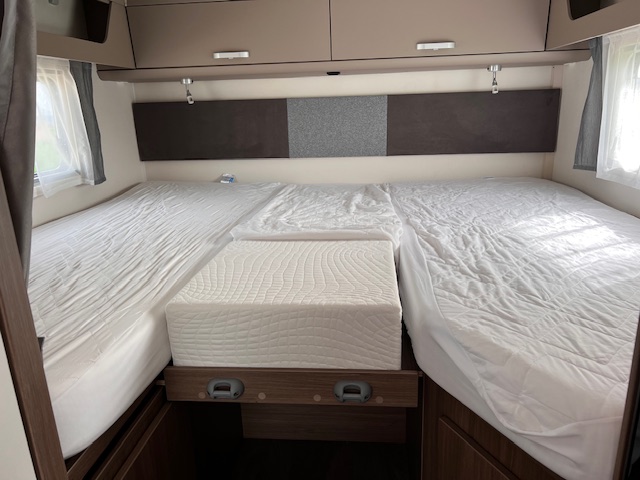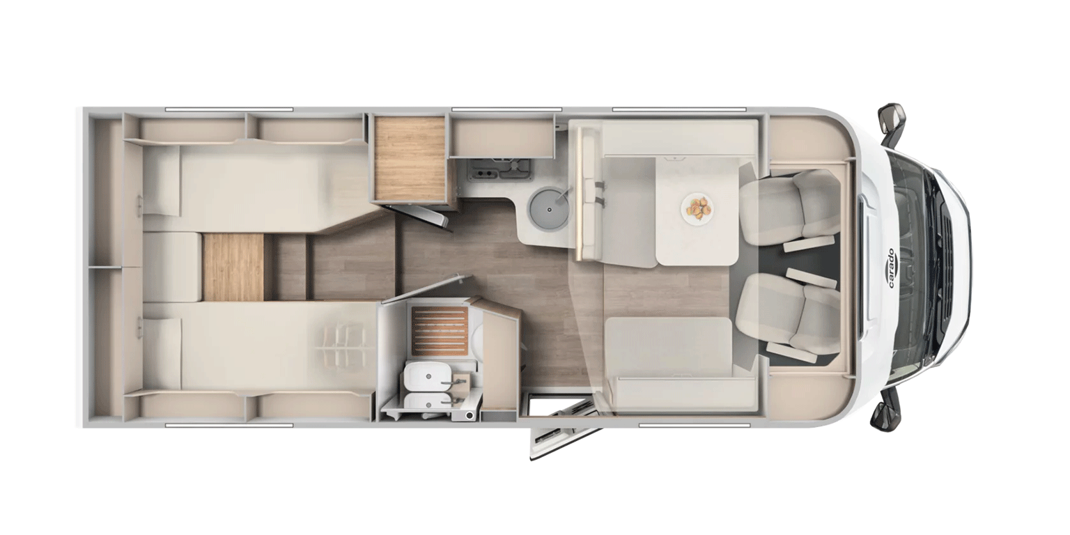 Amb 7,31 m de longitud, la T448 ofereix molt espai pel comfort: llits individuals longitudinals a la part del darrere, gran capacitat d’emmagatzematge i una àmplia zona d’estar amb un “sofà” al davant creen una autèntica sensació de sala d’estar en ruta.